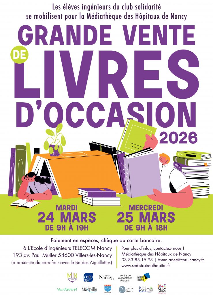 Comme chaque année, l’association « La médiathèque des hôpitaux de Nancy » organise une vente de livres à l’école Télécom de Villers les Nancy, les 24 et 25 mars 2026.